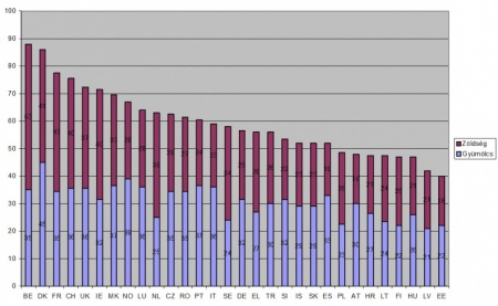A mutatók mindkét nem esetében Dániában állnak a legkedvezőbben, a Baltikumon a legkedvezőtlenebbül. A zöldségeket illetően Belgium vezeti a mezőnyt, Ausztria, Észtország és Spanyolország pedig zárja.