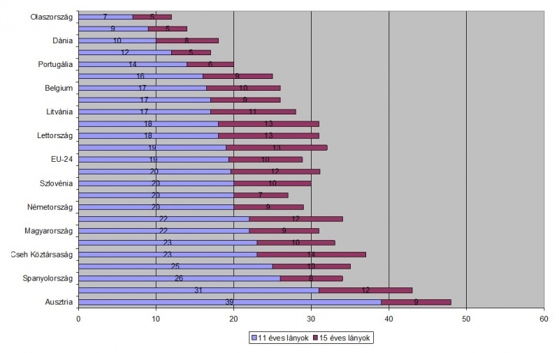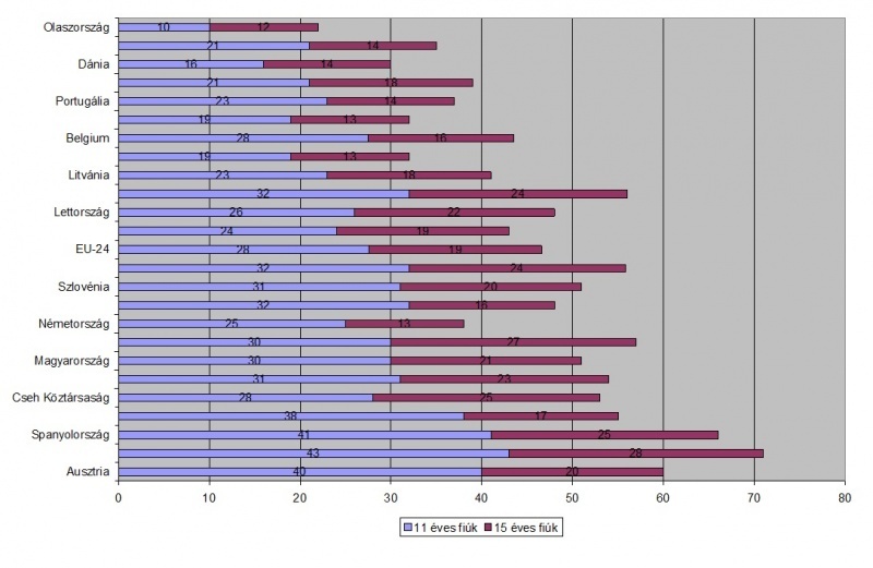 Az adatok alapján a 11 éves korosztály képviselői Ausztriában, Írországban és Spanyolországban a legmozgékonyabbak, de nekik is csupán 30%-uk sportol rendszeresen. A legkevésbé Dániában, Franciaországban és Olaszországban adnak a testmozgásra.