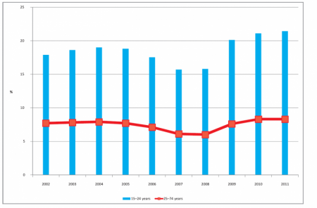 A 25 év alatti fiatalok és az ennél idősebbek munkanélküliségi rátája az Európai Unióban