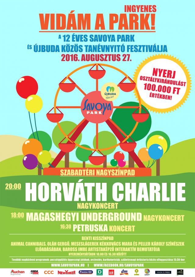 Vidám a Park! címmel nagyszabású, egész napos, ingyenes tanévnyitó fesztivált rendeznek 2016. augusztus 27-én, szombaton a budapesti Savoya Parkban. A bevásárlóközpontban délelőtt 10-kor indulnak a programok, amelyekkel a nyári szünidő utolsó hétvégéjén együtt kapcsolódhatnak ki a családok. A kisszínpadon a nap folyamán fellép az X-Faktorból ismert Oláh Gergő, az Animal Cannibals, valamint meseslágereket ad elő Kékkovács Mara és Peller Károly színművészek. A Savoya Parkban 10 és 15.30 között nyereményjáték is zajlik: azok között, akik végigmennek a pecsétgyűjtős játékokon, Újbuda jóvoltából kisorsolnak egy 100.000 forint értékű osztálykirándulást.
