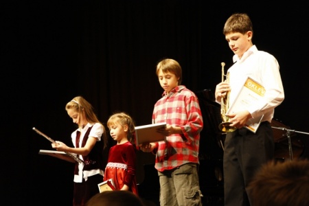 Ezután négy remek muzsikus szórakoztatta a kicsiket dobon, furulyán, trombitán és fuvolán. Az ötéves Lengyel Anna furulyán játszott és egy zeneiskolából érkezett Csari Sárával, aki viszont már fuvolázik. Fábry Adonisz (aki Fábry Sándor öltözőjét kapta!) természetes, laza dobolással vette le a lábáról a közönséget. Kőházi Attila zárta a sort remek trombitajátékkal. A különböző karakterű és életkorú gyerekek mozgalmas, színes koncerttel örvendeztették meg a közönséget.