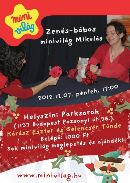 "Kárász Eszter és Gelencsér Tünde segítségével a mikulás kapcsán mesés történetet járunk körül, énekelünk, játszunk, közösen zenélünk, mondókázunk, és sokat mozgunk. A történetet a gyerekek is alakítják ötleteikkel. Megismerkedünk a hangszerekkel, amik persze bele is kerül a játszott történetbe, hangokkal megjelenítve a felbukkanó állatokat, eseményeket."