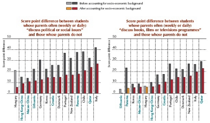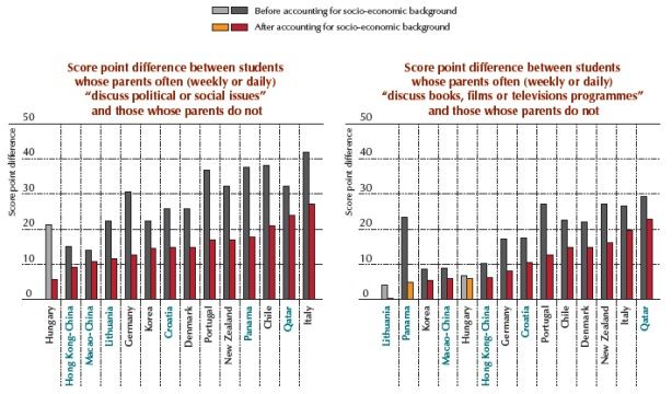 A szülői kérdőívek elemzésének van egy – elég megdöbbentő – magyar vonatkozású eredménye is. Minden országban megvizsgálták, hogy mekkora a pontkülönbség azoknak a diákoknak a szövegértés teljesítménye között, akikkel a szüleik “megvitatják a politikai és társadalmi kérdéseket”, illetve akikkel nem. Van különbség – mint ahogyan a többi tevékenység tekintetében is. A legnagyobb Olaszországban (42 pont), Magyarország esetében ennek körülbelül a fele. Egy dologban azonban kitűnik Magyarország: ha a szociokulturális különbségek hatását kiszűrjük, a különbség jelentéktelenné válik.