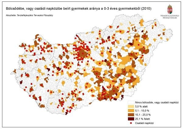 Miközben a négy évesnél fiatalabb gyerekek aránya a legnagyobb az észak-magyarországi térségben, addig ott van a legkevesebb bölcsőde! Mi több, a dél-alföldi térség, ahol a legkisebb a kisgyerekek aránya, a legjobban ellátott terület a bölcsődéket tekintve. A működő bölcsődék ma Magyarországon nemcsak szétszórtan helyezkednek el, de jól láthatóan a bölcsődei szolgáltatás nem követi a helyi valós igényeket. Dunántúlon főleg csak a nagyobb városokban működnek, míg az Alföldön a legtöbb településen van bölcsőde. Észak-Magyarország viszont bölcsődehiányban szenved, holott itt magasabb a kisgyerekek aránya az országos átlagnál. Ezeken a területeken a családi napközi intézménye sem terjedt el, miután ezek zöme fizetős és az itt élők nem tudnák megfizetni ezt a szolgáltatást.