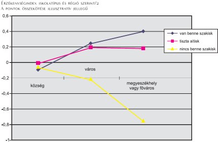 Jól illusztrálja a szelekciós hatásokat a főváros példája: a budapesti szakiskolák és a budapesti gimnáziumok érintettsége között mutatkozik a legszélsőségesebb különbség. Alábbi ábránkon mindez igen szemléletesen megjelenik: a kékkel jelzett szakiskolák és a sárgával jelzett, érettségit adó középiskolák érintettsége között annál szélesebb az olló, minél nagyobb településről beszélünk; minél több iskola között oszolhatnak el, szelektálódhatnak tanulmányi eredmény, ambíciók, családi háttér, stb. alapján a tanulók.