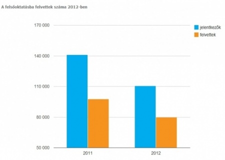 2012-ben harmincezerrel kevesebben jelentkeztek a felsőoktatásba, mint 2011-ben, és bár a felvettek száma is tizennyolcezerrel kevesebb, mint tavaly volt, a bekerülési esély kicsivel nagyobb volt idén.