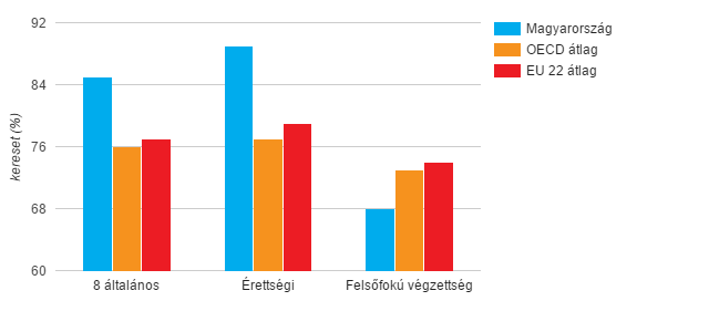 A 2016-os Education at a Glance adatai szerint a 8 általános iskolai végzettséggel és az érettségivel rendelkező magyar nők keresete jobban megközelíti férfi kollágáik bérét, mint egy átlagos OECD tagállamban, de magasabb az EU 22 országok átlagánál is. A felsőfokú végzettséggel rendelkező nők hátránya azonban tetemes, a férfi kollégáik bérének átlagosan 68%-át keresik, ami 5%-al alacsonyabb az OECD, és 6%-al az EU 22 átlagnál.