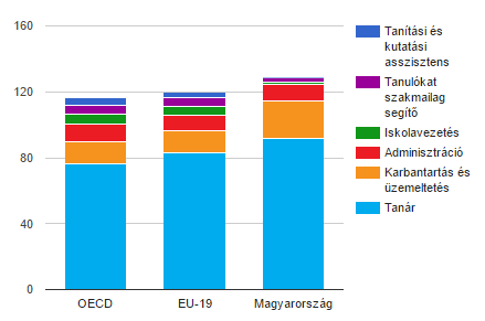 A magyar iskolákban fajlagosan jóval több pedagógus és karbantartó dolgozik, mint az OECD-országokban, miközben kirívóan kevés tanítási és kutatási asszisztenst, szakmai segítőt és az iskolavezetést támogató adminisztratív személyzetet alkalmazunk.
