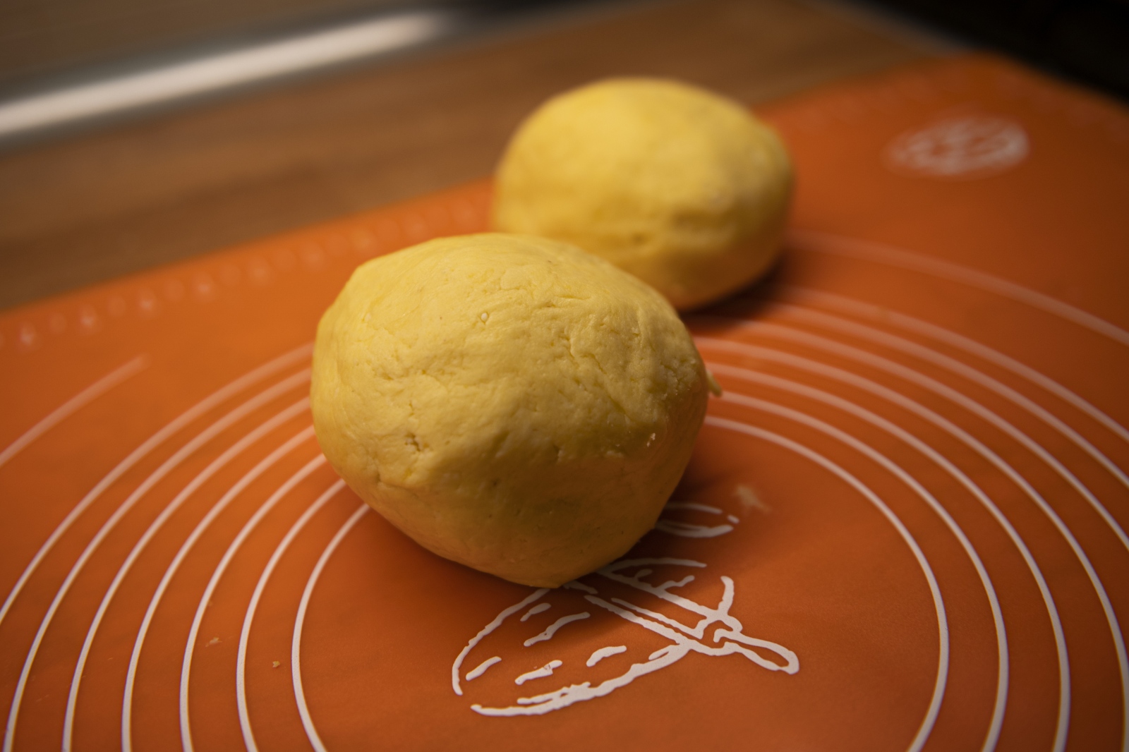 A tésztából könnyedén két gombócot formázunk. Az egyik lesz a süti alja, a másik a teteje. A tésztákat felesleges pihentetni.