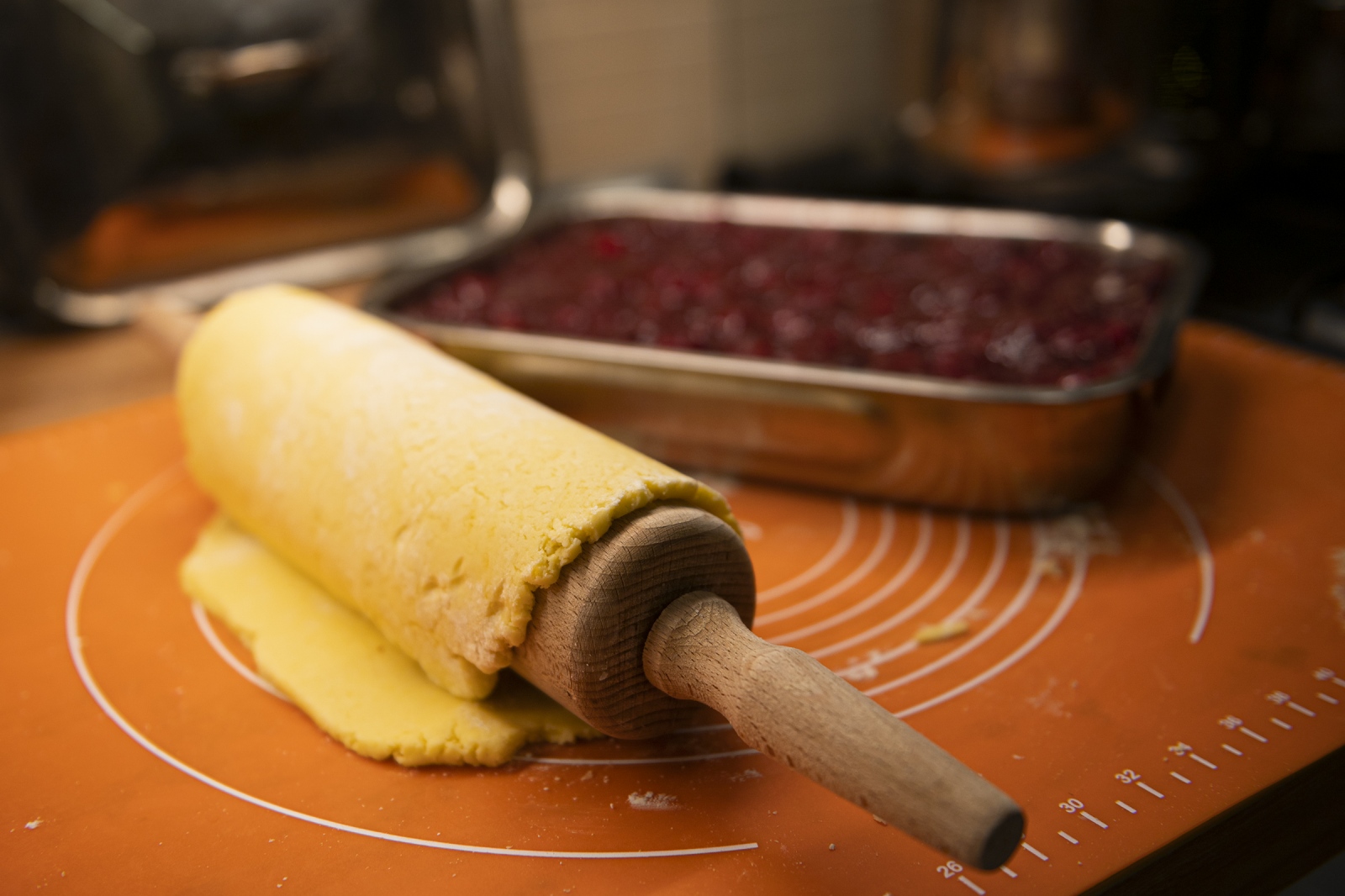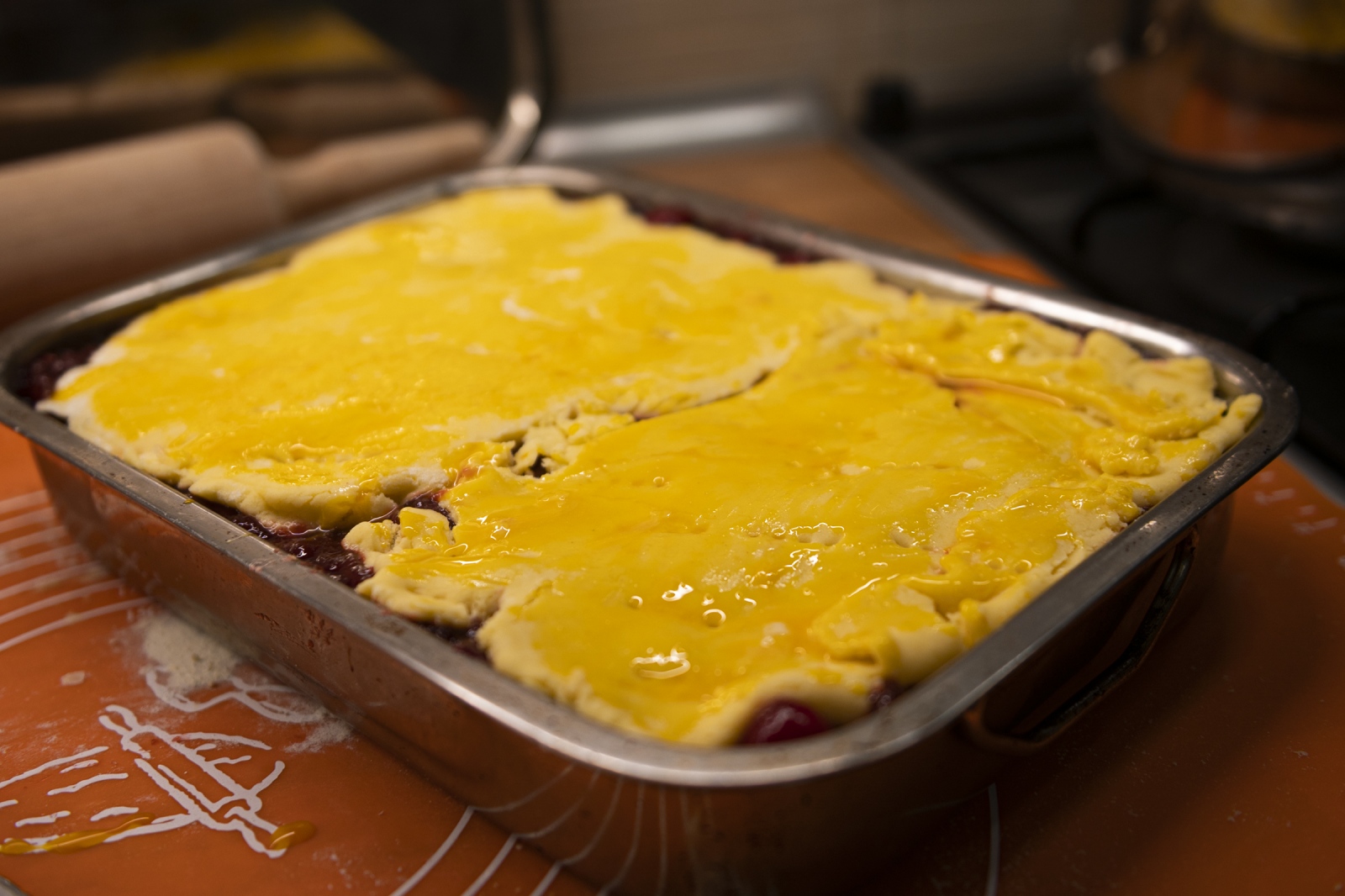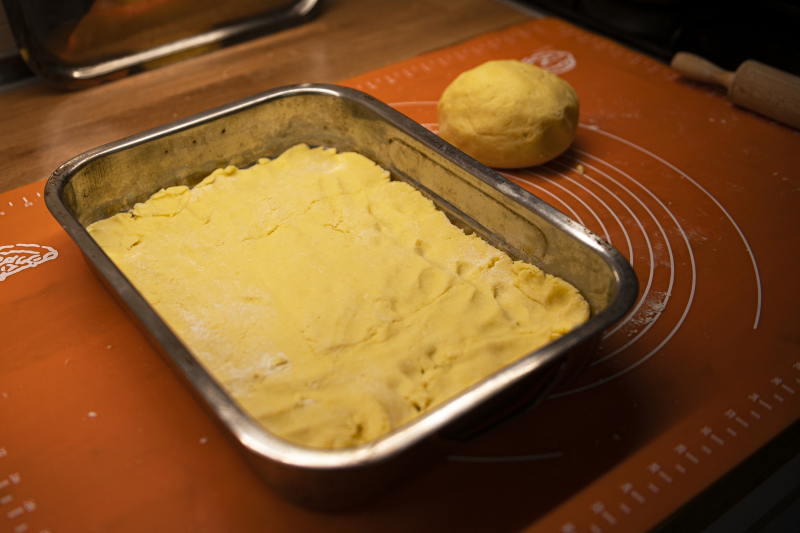 7. Kinyújtjuk a második tésztagombócot. Ügyesen rárendezgetjük a pudingos krém tetejére. Megszurkáljuk villával, tojássárgájával bekenjük a tetejét.