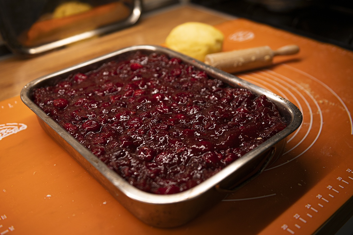 A kész meggyes tölteléket ráöntjük az alsó (nyers) tésztalapra.
