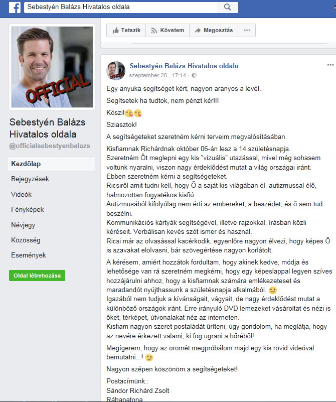 - „Egy anyuka segítséget kért, nagyon aranyos a levél. Segítsetek, ha tudtok, nem pénzt kér!!! Köszi!” – írja röviden Sebestyén Balázs 2017. szeptember 28-ai Facebook bejegyzésében. Mivel a kérése nem túl nagy, az öröm ellenben annál nagyobb lehet egy zárt világában élő, a kommunikációs nehézségekkel küzdő fiúnak, ezért biztosra vesszük, hogy az apró figyelmességtől lelkileg szárnyra kapna - így mi is örömmel osszuk meg veletek az anyuka kérését. Íme, a levél, amit az anyuka Balázsnak írt.
