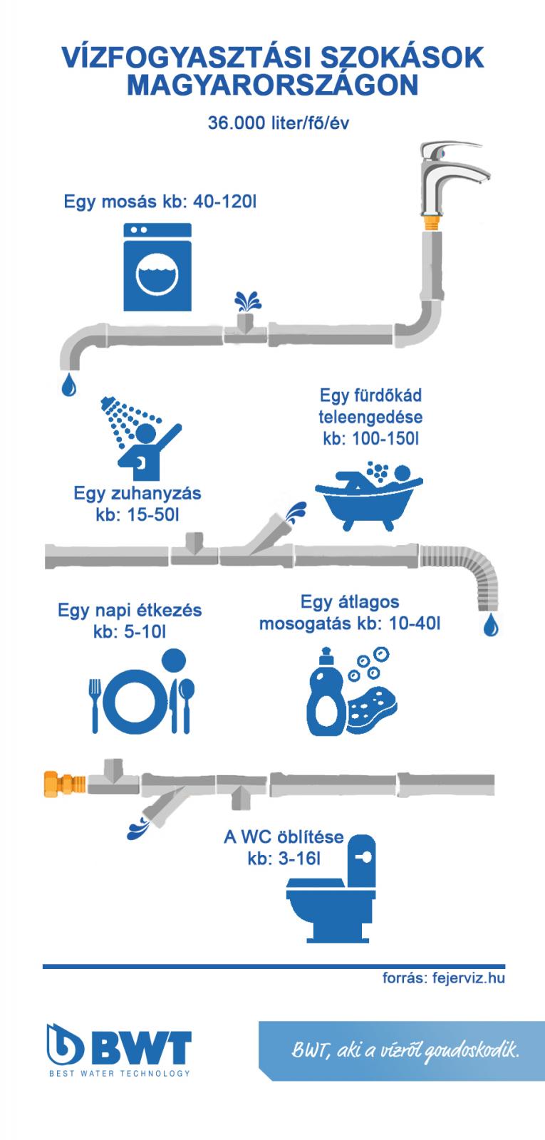 A napi vízfogyasztásból a legtöbbet a fürdésre használjuk el: egy átlagos kád fürdővíz 100-150 liter, míg egy normális hosszúságú zuhanyozás legalább 15-50 liter vizet vesz igénybe. Egy mosogatás körülbelül 10-40 litert jelent, a WC öblítésre 3-16 litert használunk el. A ruhák mosására alkalmanként 40-120 liter vizünk fogy, nem beszélve a kézmosásokról, a takarításról, locsolásról, kocsimosásról, vagy akár a főzésre-ivásra használt vízről. Utóbbi kapcsán 5-10 litert fogyasztunk személyenként naponta – ezek mind plusz fogyasztást jelentenek.*