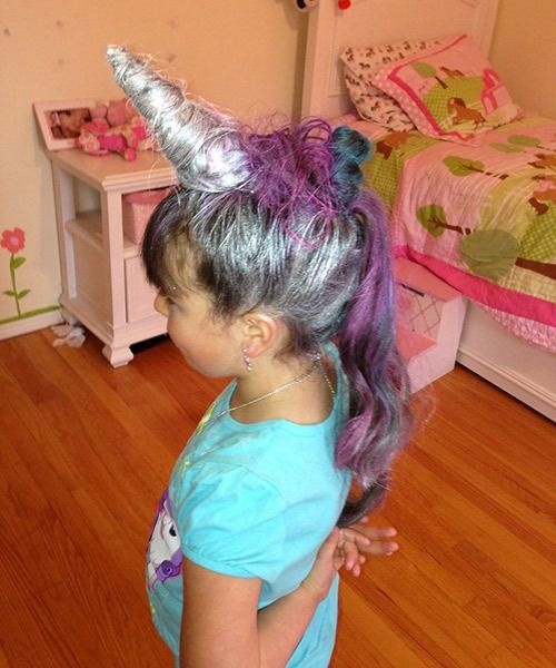 Ha ezt a hajdolgot továbbgondoljuk, akkor saját anyag felhasználásával kialakítható az unikornis szarva is. Csak egy tölcsért kell hajcsattal rögzíteni a fejtetőre, majd körbeburkolni saját hajjal, rá hajlakk és némi szín, lehetőleg ezüst, és máris kész.
