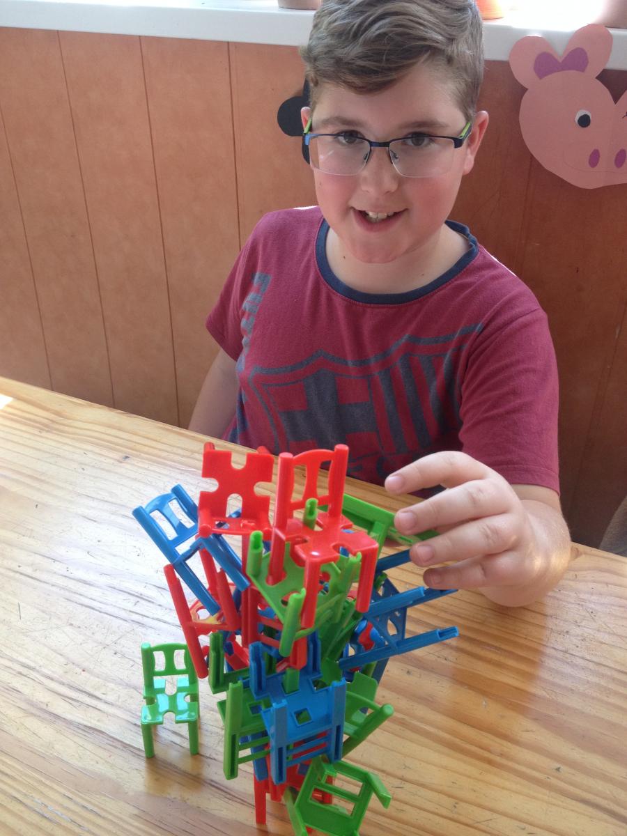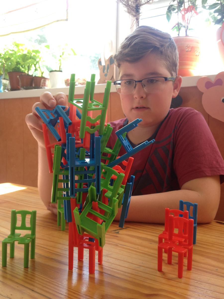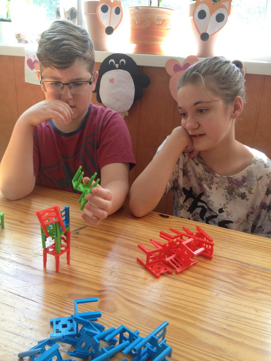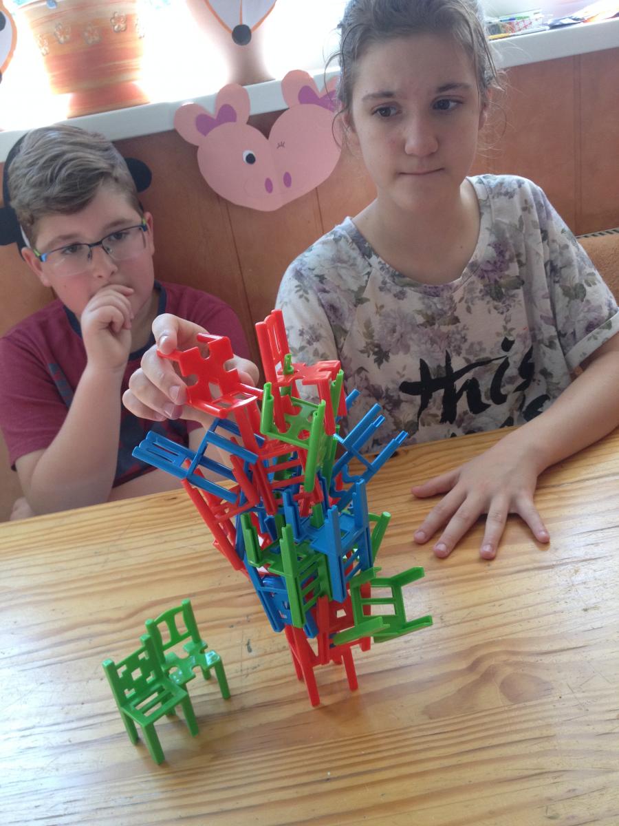 | 3. Eleinte könnyű feladatnak tűnik ez, hisz a székeket csak el kell forgatni egymáson. | 4. Csakhogy egyensúlyban is kell tartani az egyre növekvő széktornyot. | |