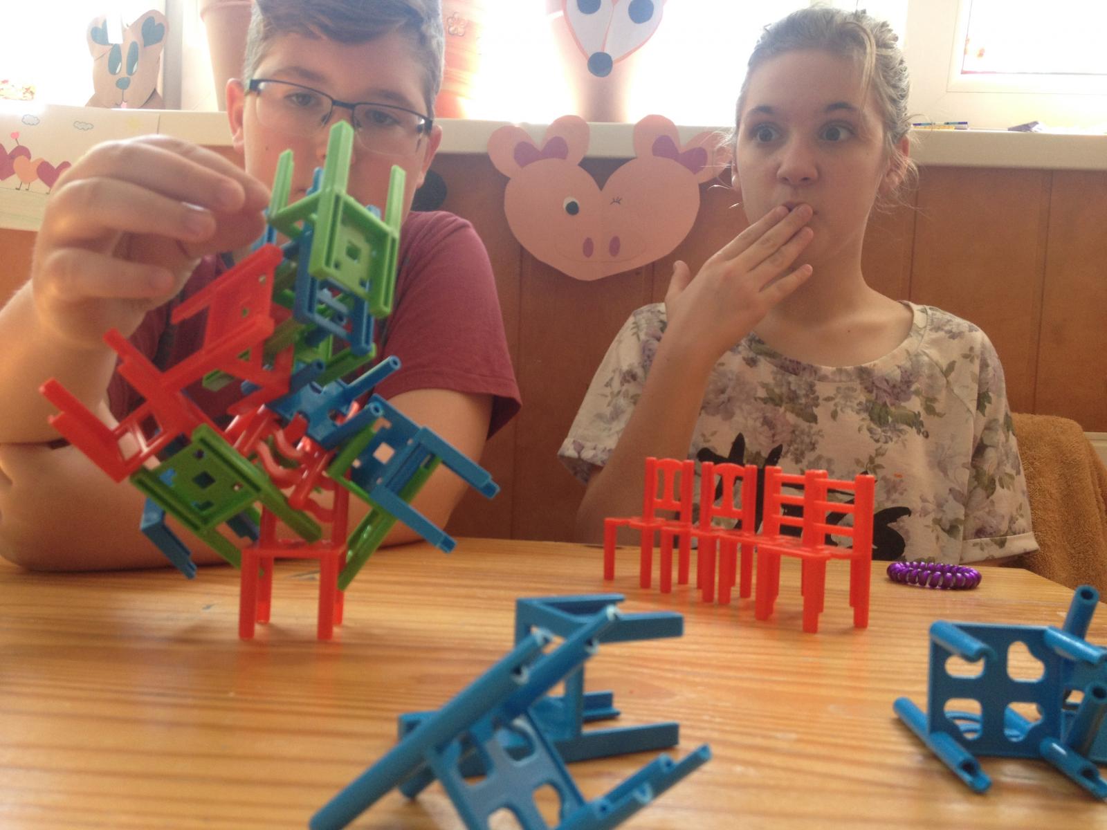 | 1. A játékot különböző színű kis műanyag székekkel játsszuk. Ezekből építünk tornyot úgy, hogy a játékosok egymás székeire helyezik a sajátjukat, óvatosan, hogy az le ne essen. | 2. Minden szék hátlapján és ülőfelületén kis lyukak, vágatok, bemélyedések vannak. Ügyesen ezekbe kell beilleszteni a következő szék lábát vagy támláját. | |