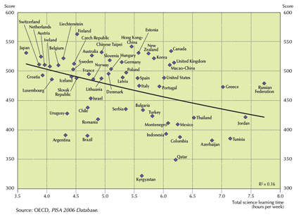 A legjobbak között lévő Ausztráliában, Japánban, Finnországban és Új-Zélandon például a teljes természettudomány-tanulásra fordított idő 70 százaléka tanórai keretben valósul meg és csak 30 százalék különórák keretében. Ez azonban még mindig nem magyarázza eléggé, hogy miért annyira jók az ottani teljesítmények. Főleg annak tükrében nem, hogy a legjobban teljesítő országokban - Új-Zéland kivételével - általában az OECD átlagnál összességében kevesebb időt fordítanak természettudományos tanulásra.