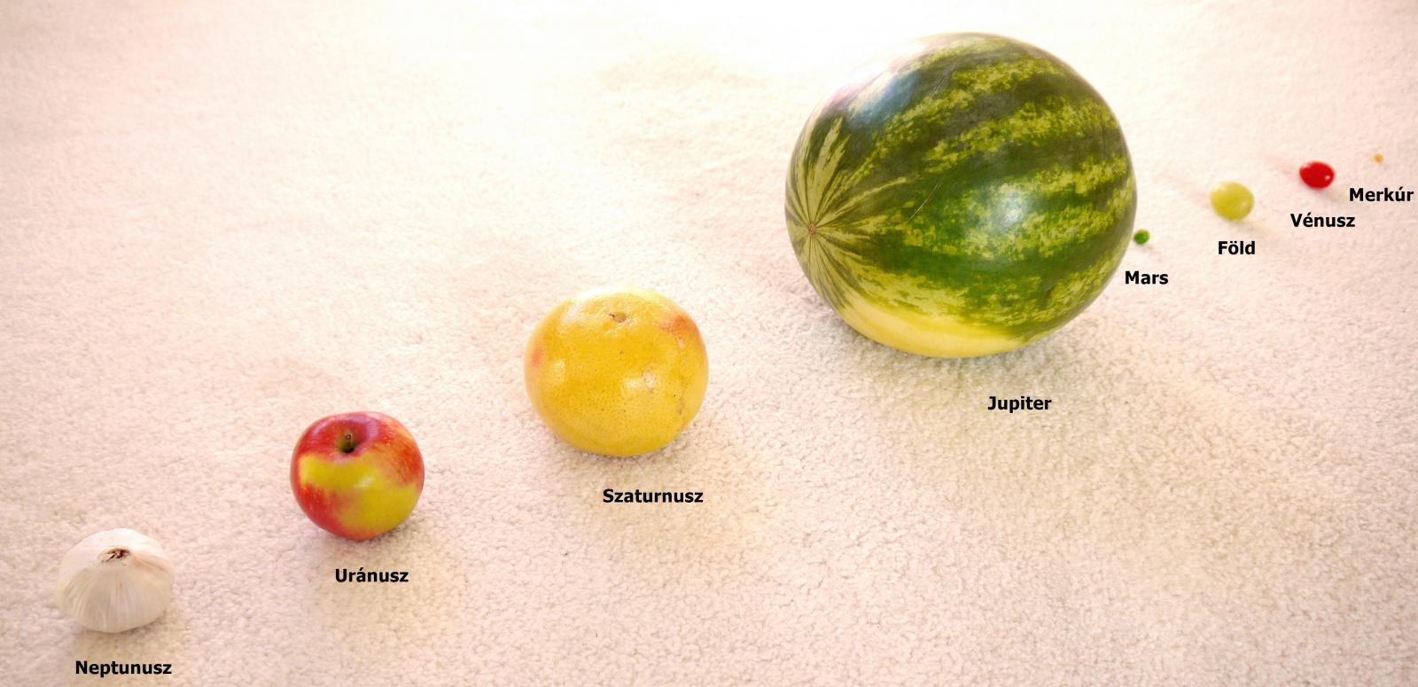 Bár a Naprendszer bolygói olyan óriásiak, hogy nagyon nehéz elképzelni azokat, az egymáshoz viszonyított méretük gyümölcsökkel és zöldségekkel könnyen modellezhető. A legkisebb bolygó a Merkúr (egyenlítői átmérője 4864 km), először neki kell kitalálni egy megfelelően kicsi gyümölcsöt vagy zöldséget, ami alapján a többi bolygó méretét arányosan nagyítani tudjuk. Válasszunk a Merkúr megfelelőjének egy kukorica szemet (én pattogtatni való kukoricát választottam). Ebben az esetben a Vénusz (12 103 km) egy kicsi koktélparadicsom, a Föld (12 756 km) egy nagy szőlőszem, a Mars (6768 km) pedig egy borsószem lesz. A Jupiter óriási méretét (142 948 km) egy görögdinnyével, a Szaturnuszt (120 536 km) egy nagy grapefruittal, az Uránuszt (51 118 km) egy almával, a Neptunuszt (49 528 km) pedig egy nagy fokhagymával közelíthetjuk.