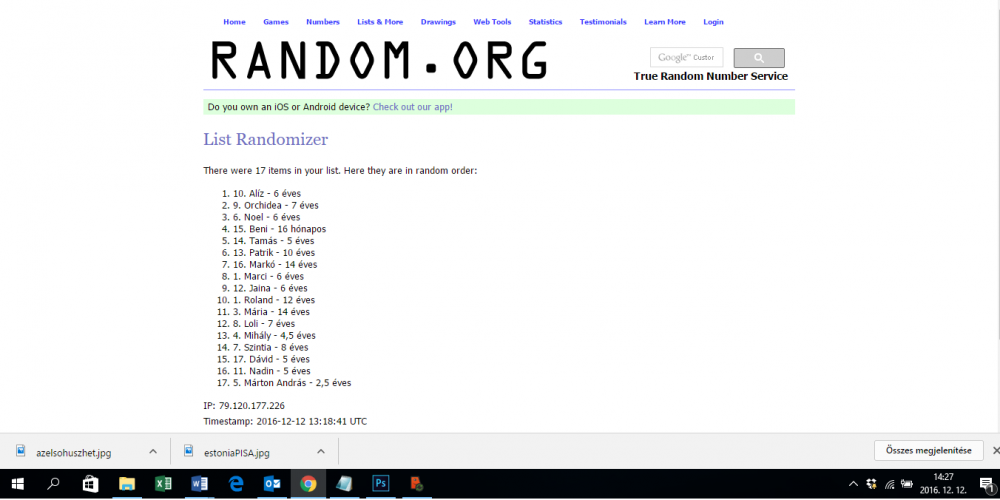 ♣ Karácsonyi kívánság játéka. Megtartottuk a nyertesek sorsolását, (random sorsoló programmal), melyről a videót is megtekinthetik. A három szerencsés nyertesünk: