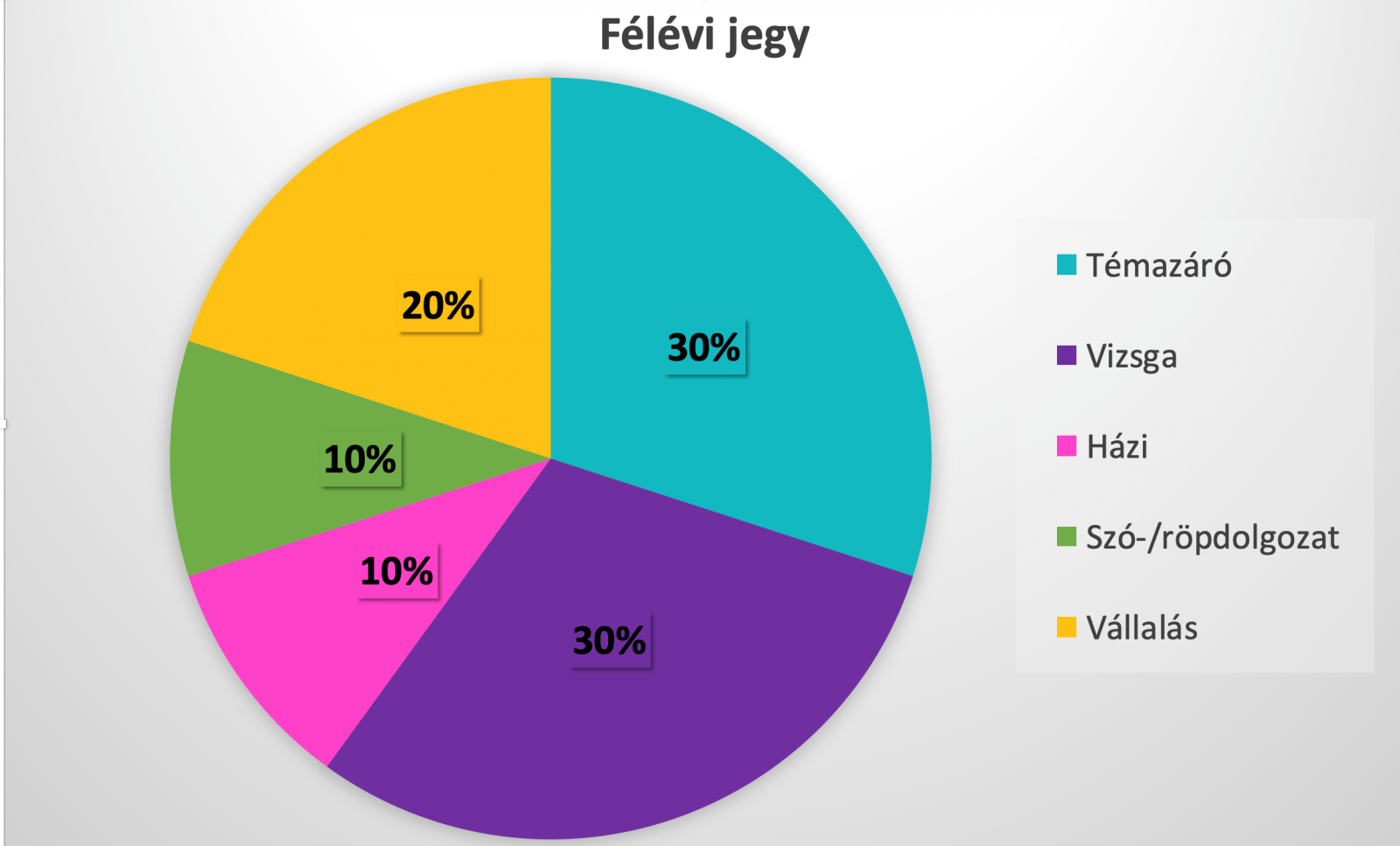 Az értékelés év közben százalékok alapján történik, bizonyos rész saját vállalás alapján (kiselőadás tartása például), érdemjegyet pedig csak félévkor és év végén kapnak a diákok. Minden tantárgyból 80-20%-os aránnyal dolgozunk, ami azt jelenti, hogy a nagyobb rész a kötelező elemeket tartalmazza, a kisebb pedig szabadon választható. Itt is visszaköszön a szlogenünk, miszerint mindenki maga felelős a tanulásáért. Ha ezt mi komolyan gondoljuk, akkor egy diák nem csak elszenvedője kell, hogy legyen a mi értékelési kedvünknek, hanem alkotója is. Fontos szerep jut már ekkor az önismeretnek is, hogy mindenki tudja magáról, mi az, amiben jó, és ha esetleg nem mennek annyira a kötelező részek, hogyan, mivel tudja teljesítményét jobbá tenni. Emellett az is fontos, hogy érzékelje, miben kell fejlődnie, jobbá válnia.
