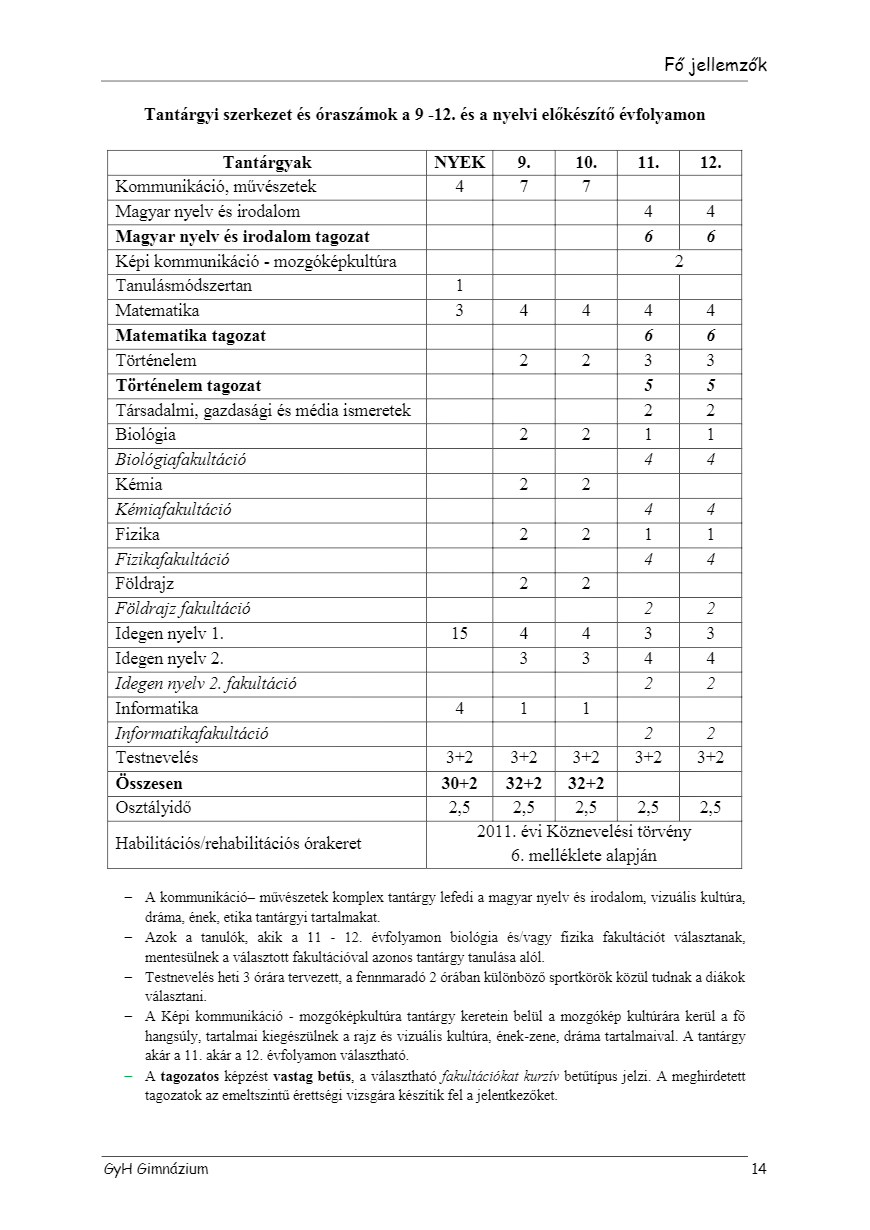 Milyen fontosabb elemeket, alapvetéseket tartalmaz a GYH Gimnázium tanterve?