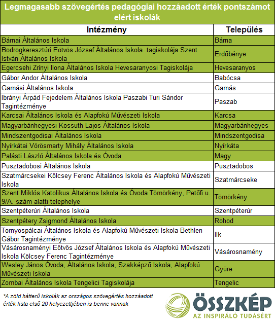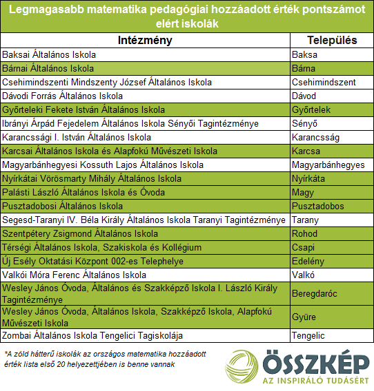 Mind a húsz intézmény kiérdemli az elismerést. Az pedig különösen figyelemre méltó, hogy a legjobban teljesítő rossz társadalmi hátterű iskolák élcsapatának több mint fele az országos ranglista első húsz helyezettje között van, a hatodik osztály végén készített kompetenciamérések alapján számított hozzáadott érték alapján.