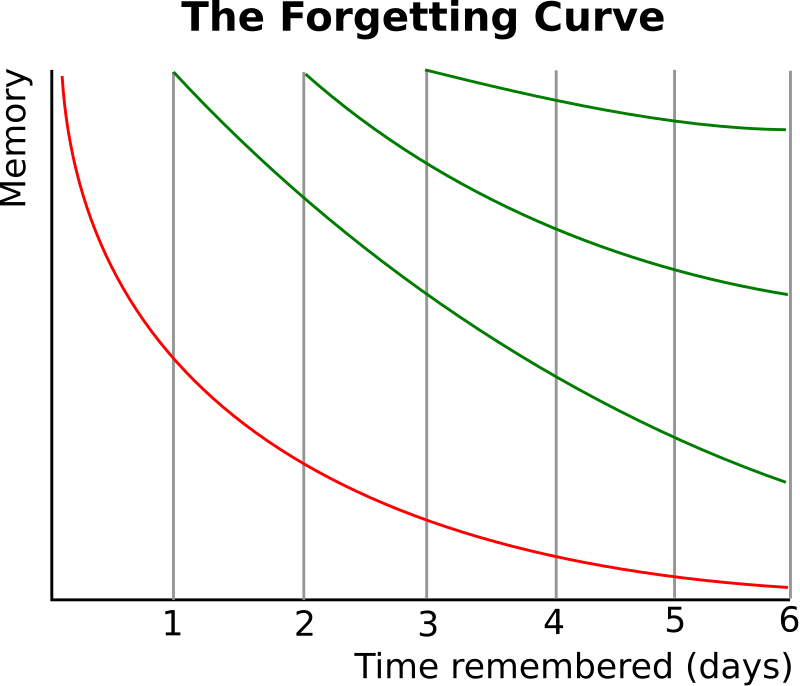 A felejtési görbe: a piros görbe jelzi a kezdeti tanulás utáni emlékezést, míg a zöldek a gyakorlás hatását mutatják. (Forrás: Wikipédia)
