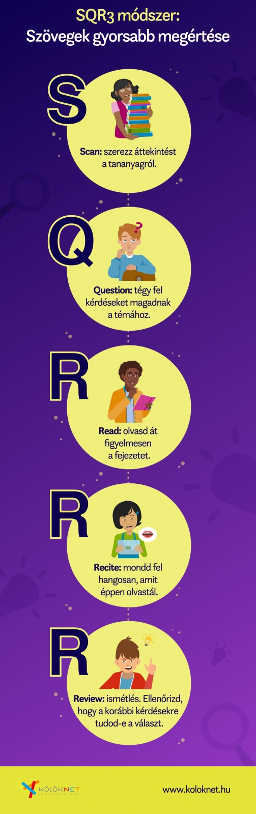 - A „Review”, azaz „Ismétlés” rövidítése. A gyerek önállóan ellenőrizze magát (ne mi kérdezgessük), hogy a „Q” lépésben megfogalmazott kérdéseire a szövegben megtalálta-e a választ, és hogy sikerült-e megjegyeznie a válaszokat.
