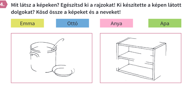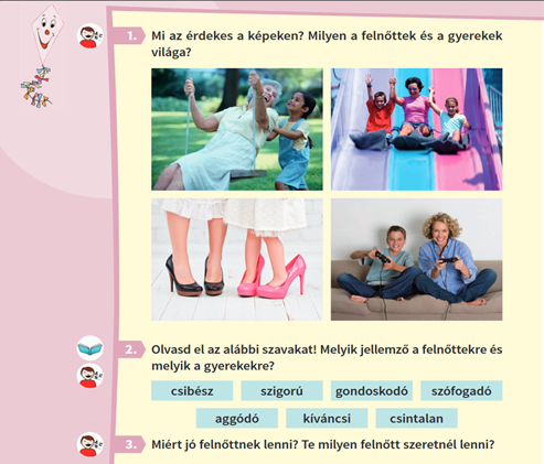 Azt sugallja a kép és a feladat is, hogy a felnőttek világa (is?) vidám és csintalan. Elsőre pozitív a benyomás, de hoppá, milyen érdekes, csak nőket, anyákat és nagymamákat látunk a képen a gyerekekkel. Tovább erősödik tehát az a kép, hogy van a szigorú férfivilág és a rendetlen gyerekvilág és közötte valami meghatározatlan, amorf női világ, amely összeköti a kettőt. Figyeljük meg, hogy eddig nem láttunk valódi szoros és szerető apa-gyerek kapcsolatot!