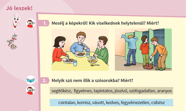 A Jó leszek részben még inkább megerősödik, hogy a felnőtt világ jó és helyes, a gyereké meg vásott, égedelem, stb. Ha megnézzük az alábbi képet, azt is láthatjuk, hogy mintha csak a fiúk lennének rosszak (aktívak), a lányok rendesen (engedelmesen, besimulóan) viselkednek. Ez még jobban megerősíti a tradicionális, patriarchális családképet. Ráadásul nem lehet elmenni amellett sem,– ahogy a vizuális szakértő is felhívta rá a figyelmet -, hogy, az illusztrációk sem mindig megfelelőek. A gyerekek arca az alábbi képen meglehetősen jellegtelen és elnagyolt.