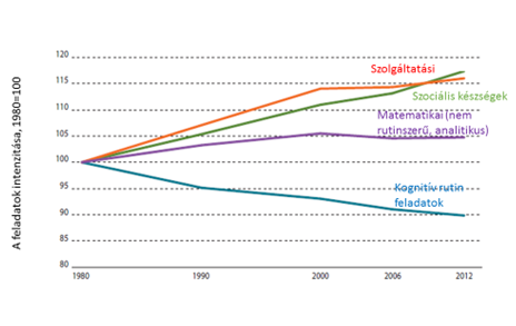 Vegyük sorra a hiedelmeket. Az a félelem, hogy a robotizáció, mesterséges intelligencia munkahelyek tömegét szünteti meg, csak részben igaz. Ugyanis, ahogyan ezt az ipari forradalmak során mindig is láthattuk, az új technológiákkal egyben új típusú munkák és munkahelyek is teremtődnek. A munkafeladatok változását elemző amerikai kutatások arra mutatnak rá, hogy rohamosan csökken a gépekkel kiváltható rutin jellegű kognitív feladatok aránya. Ennél is érdekesebb, hogy a matematikai és természettudományos ismereteket is igénylő nem rutin jellegű feladatok aránya is stagnál 2000 óta, míg a szolgáltatásokhoz kötődő és szociális készségeket igénylő feladatok aránya nő.
