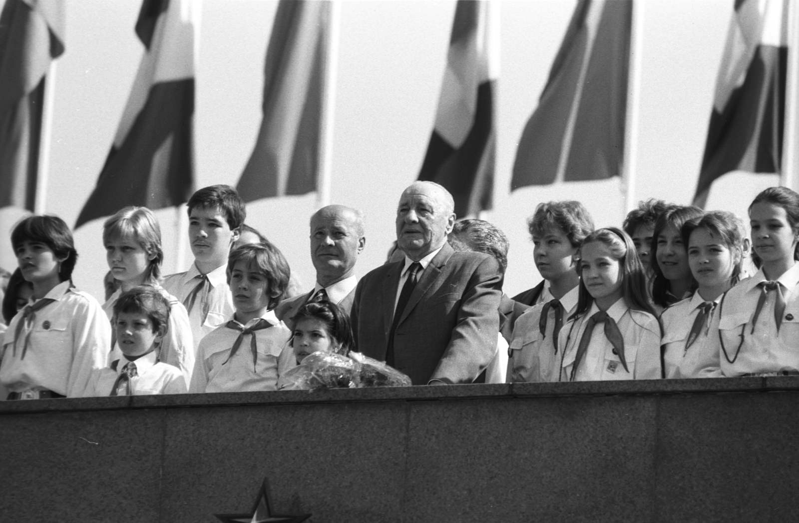 Ötvenhatosok tere (Felvonulási tér), dísztribün, középen Kádár János az MSZMP KB első titkára, mögötte balra Losonczy Pál az Elnöki Tanács elnöke. 1986, Fortepan / Adományozó: Szalay Zoltán
