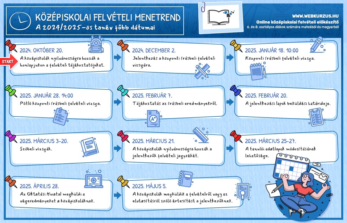 A központi írásbeli felvételire 2024. december 2-ig lehet jelentkezni. A vizsgákat 2025. január 18-án, szombaton, 10 órától tartják, míg a pótló vizsga időpontja 2025. január 28-án, 14 órakor lesz. Fontos megjegyezni, hogy a központi írásbeli vizsgára való jelentkezés nem helyettesíti a középfokú iskolákba történő jelentkezést, amelynek határideje 2025. február 20. A szóbeli vizsgák időszaka 2025. március 3. és március 20. között lesz.