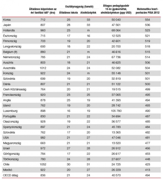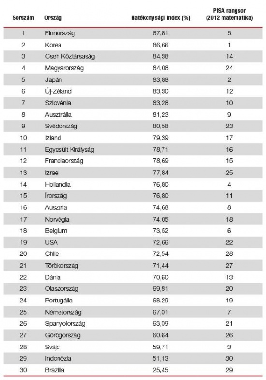 Az oktatás hatékonyságát egyes szakértők szerint több tényező: a pedagógusbérek, az osztálynagyság és a teljesítmény együttes kombinációja adja ki [2]. Ennek függvényében egyaránt találhatunk olyan országot, akik sok ráfordítással keveset érnek el, de fordítva is: kevesebb erőforrással relatíve jól teljesítenek. A PISA eredményeket a pedagógus bérével és az egy pedagógusra jutó tanuló aránnyal összevetve hozott létre néhány szakértő egy ún. oktatáshatékonysági indexet (lásd 1. táblázat).
