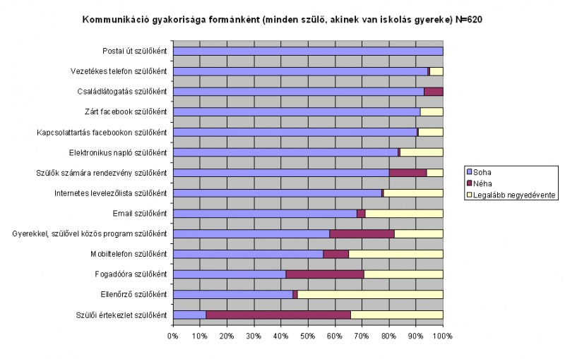 De még az ezek révén történő kapcsolattartásra is legfeljebb negyed-, sőt félévente kerül csak sor. A legtöbb kommunikációs formával a szülők több mint a fele nem él, negyven százalékuk csak a szülői értekezleten találkozik a pedagógussal. A közöttük folyó kommunikáció tehát nem tekinthető intenzívnek. Még drámaibbnak tűnik a helyzet, ha azt is figyelembe vesszük, hogy a kérdőívünket általában a legmotiváltabb középosztálybeli, városi anyukák töltötték ki.