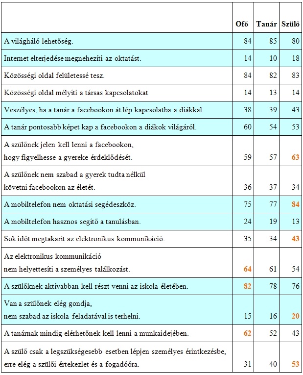 Az új infokommunikációs eszközökkel szemben a pedagógusok kevesebb előítélettel viseltetnek, mint a szülők, és nagyobb arányban gondolják úgy, hogy a világháló és a mobiltelefon hasznos lehet a tanulásban. A szülők majdnem egyötöde szerint az internet terjedése megnehezíti az oktatást és 84 százalékuk szerint a mobiltelefon nem oktatási segédeszköz. A tanár és a diák közötti facebook kapcsolatot is aggályosabbnak tartják, mint a pedagógusok (ld a táblázatot).