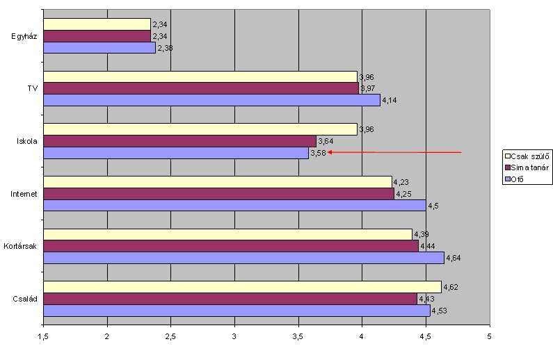 A válaszadók szerint legkisebb hatásuk az egyházaknak van, a második leggyengébb hatást pedig az iskola gyakorolja a gyerekekre. Meglepő, hogy maguk a pedagógusok, és közülük is az osztályfőnökök tartják kisebb súlyúnak az iskola szerepét. Valamennyi válaszadó a családot véli az egyik legfontosabb tényezőnek a fiatalok értékvilágának alakításában. A család hatásának döntő jelentőségében megegyezik a három csoport, de az osztályfőnökök szinte azonos erősségűnek vélik ezzel a kortársak és az internet szerepét. A szülők érdekes módon, fontosabbnak ítélik az iskola hatását, mint az ott működő pedagógusok.