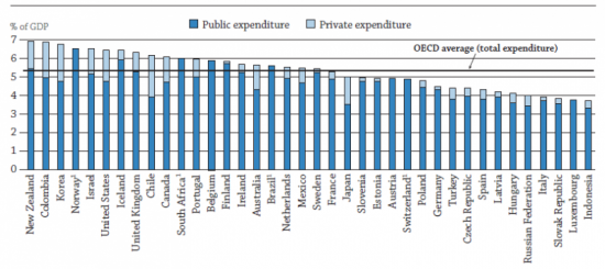 Az alábbi ábrán az látszik, hogy az OECD országaiban mennyit költöttek 2012-ben oktatásra a GDP %-ában, általános iskolától felsőoktatásig. A sötétkék szín az állami kiadásokat, a világoskék a magánfinanszírozást jelöli.