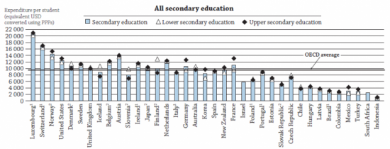 Fontos ugyanakkor mellé tenni, hogy ez az összeg hogyan viszonyul az országok tanulószámhoz, azaz, hogy mekkora az egy diákra jutó kiadás. Jól látszik, hogy például Luxemburgban, ahol a GDP viszonylag kis részét fordítják az oktatás finanszírozására, a gazdasági és demográfiai adottságok miatt mégis a legmagasabb az egy általános iskolai diákra jutó összeg (vásárlóerő-paritáson).