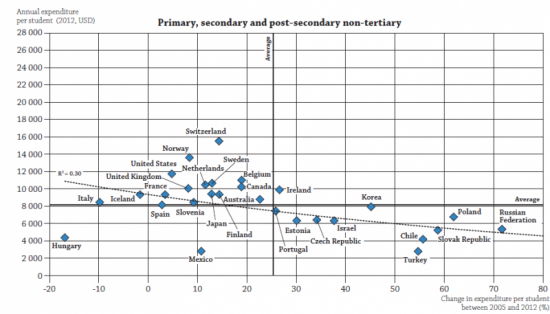 Az OECD indikátorkötete, az Eurydice kiadvány hosszabb időtávon is vizsgálja, hogy hogyan alakultak az oktatási büdzsék az egyes országokban. Mint a lenti ábrán is látszik, a legtöbb OECD országban nőtt az egy diákra fordított kiadás összege 2005 és 2012 között, míg hazánkban körülbelül 17%-al csökkent.