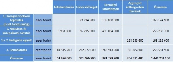 *Az aggregált költségvetési forrásokból származó kiadás az általános és középiskolai szint esetében a központi költségvetésből az egyházi és magán intézmények finanszírozására fordított összeget tartalmazza, a felsőoktatás esetében pedig szintén az egyházi/magán intézmények finanszírozására fordított összeget, valamint a kitűnőnek ítélt felsőoktatási intézmények támogatását, és az EU-s támogatásokat tartalmazza