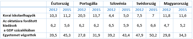 Az európai Oktatási és Képzési Figyelő 2016 jelentése érdekes adatokat közöl az országokról. A korai iskolaelhagyók arányát a portugálok jelentően csökkenteni tudták 2012 óta, míg a szlovéneknél és svédeknél ez mindig is igen alacsony volt. Az oktatásra fordított kiadások a GDP százalékában rendre magasabbak a többi országban. Bár Magyarország az adatok alapján némileg javított ezen az arányon 2015-re, de még mindig alatta marad a többieknek (nem beszélve arról, hogy egy év javulása nem kárpótolhatja a több évtizedes alulfinanszírozottságot). Az egyetemet végzettek aránya pedig jóval magasabb az észteknél, szlovéneknél és a svédeknél is, mint nálunk.