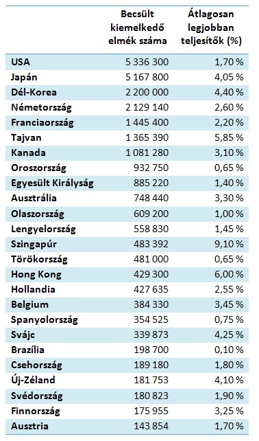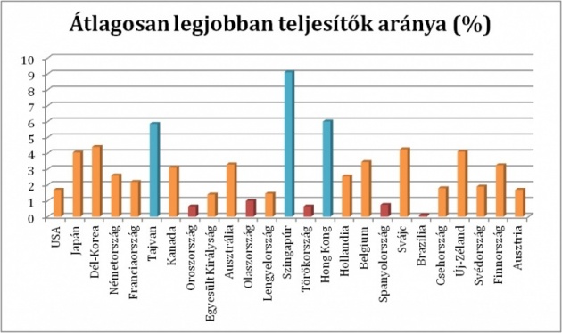 Érdemes megnézni, hogy bár az USA így a lista élén szerepel, de ha csak a százalékos arány néznénk, jóval hátrébb sorolódna. Másik jó példa Szingapúr, ahol arányaiban nagyon magas a jól teljesítők száma. Kína nem szerepel a listán, de ha a városokat külön vizsgálnánk, akkor Shanghai a harmadik helyen szerepelne.