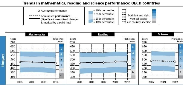 Az OECD tagállamok mezőnye tehát jelentősen átrendeződött. Magyarország – eredményei alapján – 2003-ban is és 2012-ben is az Egyesült Államokhoz, Szlovákiához és Spanyolországhoz állt közel. Azonban a 2003-ban még ebbe a csoportba tartozók közül Lengyelország, Lettország, Luxemburg és Norvégia diákjai 2012-ben már az aktuális magyar eredménynél értékelhetően magasabb pontszámot értek el. 2012-ben a magyar diákok teljesítménye Portugália, és Olaszország diákjaiéhoz hasonló, akik 2003-ban hozzánk képest gyengébb eredményt értek el, de 2012-re már javítottak eredményeiken.