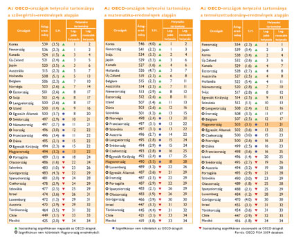 A PISA 2009 élén négy iskolarendszer áll: Sanghaj-Kína, Korea, Finnország és Hongkong-Kína iskolarendszere. Közülök is kimagaslik Sanghaj-Kína eredménye (556): nincs olyan iskolrendszer, amely hasonló eredményt tudhat a magáénak. Nyilvánvaló, hogy sem Sanghaj, sem Hongkong – ez a két hatalmas gazdasági potenciállal rendelkező megalopolisz – nem reprezentálja Kína egészét. Korea és Finnország viszont igazi országok heterogén település struktúrával és demokratikus berendezkedéssel.