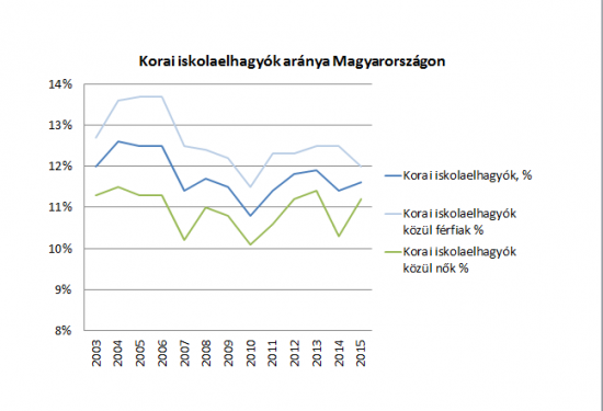 Magyarországon 2013 és 2014 között csökkent, 2014-ről 2015-re azonban ismét nőtt a korai iskolaelhagyók aránya, követve ezzel a 2010 és 2013 között jellemző trendet.