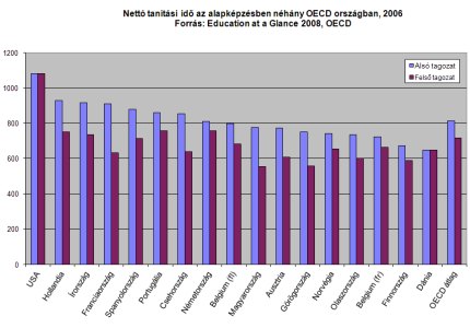 Épp ezért úgy vélem, a nyári szünet hosszát és tartalmát érdemes lenne átgondolni. Tény, hogy a magyar nyári szünet a hosszabbak közé tartozik a maga 11-12 hetével. Igaz ugyan, hogy vannak helyek, ahol még ennél is hosszabb, például a balti vagy déli országokban 13 hét, de Európában többnyire inkább a rövidebb, 6-9 hétig tartó nyári szünet a jellemző. Tegyük ehhez hozzá, hogy a nettó tanítási idő tekintetében az alsó tagozaton a középmezőnyben, a felső tagozaton viszont már hátul kullogunk (lásd az ábrát), vagyis nemzetközi összehasonlításban a magyar gyerekekre kevesebb közvetlen pedagógusi figyelem jut, és ezt leginkább a hátrányos helyzetűek sínylik meg. Az ő esetükben ugyanis az iskolai és nyári ingerszegény környezetet nem mindig tudja vagy akarja a család kompenzálni.