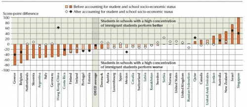 Az ábra egy olyan elemzés eredményét mutatja be, ami azt vizsgálta, hogy van-e matematikából teljesítménybeli különbség azok között az iskolák között az egyes OECD országokban, ahol a diákok 25 százaléka bevándorló, és ahol ennél alacsonyabb ez az arány. Ha nem vesszük figyelembe a diákok szociális és gazdasági hátterét (oszlopok: matematika pontszám különbség), akkor sok olyan országot találunk, ahol a nagyobb bevándorló diák aránnyal rendelkező iskolák rosszabbul teljesítenek matematikából (pl: Olaszország, Finnország). Ha azonban kiszűrjük a családi háttér hatását (rombuszok), akkor látszik, hogy a különbség jelentősen csökken, esetenként teljesen eltűnik (fehér rombusz).