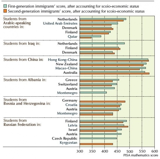Az alábbi ábrán azt látjuk, hogyan teljesítenek az első (kék) és második (narancssárga) generációs bevándorlók a különböző országok iskolarendszereiben, pontosabban, hogy hány pontot értek el a 2012-es PISA matematika teszten. Az vizsgálat során az elemzők kiszűrték a diákok szociális és gazdasági hátteréből fakadó különbségeket, hogy tisztán a különböző iskolarendszerek hatását láthassuk.