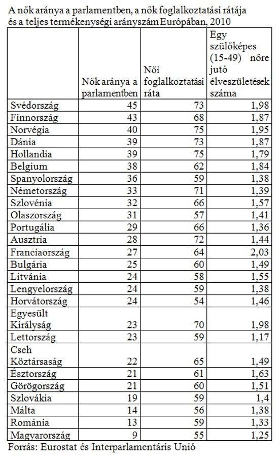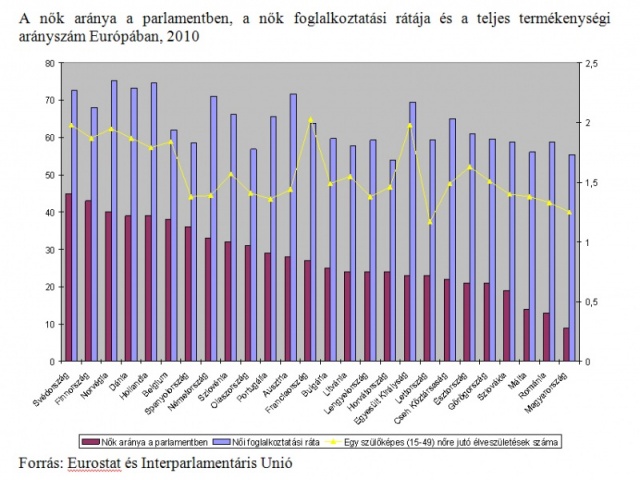 Persze ezek a tények biztosan nem hatják meg politikus férfiainkat. De menjünk egy kicsit tovább. Ha megnézzük a nők foglalkoztatási rátáját és a termékenységi arányszámot, hát itt is sereghajtók vagyunk. Csak azért nem a legeslegutolsók, mert a termékenységet tekintve Lettország, a női foglalkoztatottságot tekintve Horvátország mögénk került. Jól láthatóan valamilyen sztochasztikus összefüggés tapasztalható a három adat között, méghozzá egy irányba. Minél kevesebb a nő a parlamentben, annál kisebb a foglalkoztatottságuk és annál kevesebb gyereket szülnek. Természetesen távol álljon tőlünk, hogy egyenes ok-okozati hatást tételezzünk fel, de az biztos, hogy erővel és elnyomással nem sokra jutnak a tisztelt urak ott a parlamentben a nőket illetően. Hát nem is kellene erőltetni. Hogy mire lenne szükség, azt már megírtuk egy másik cikkben.